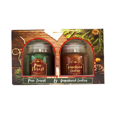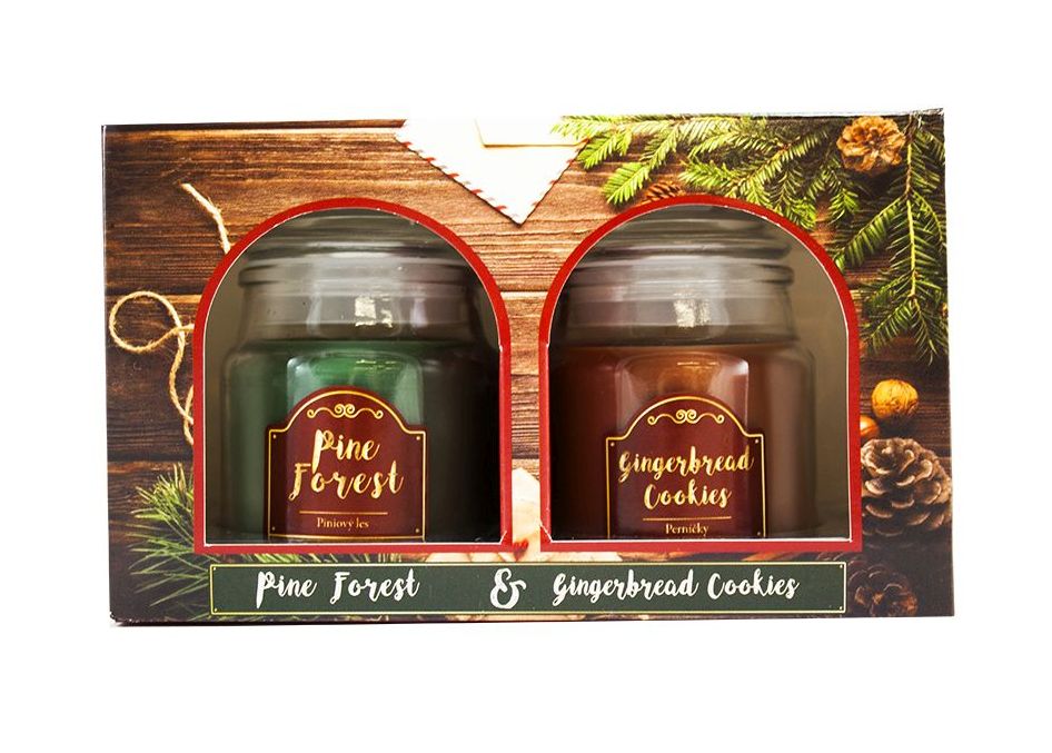 Vianočná sklenená sviečka s tesniacim viečkom - dodáva sa v sade 2 kusov - Jedna sviečka s vôňou borovicového lesa a jedna sviečka s vôňou perníkových sušienok.