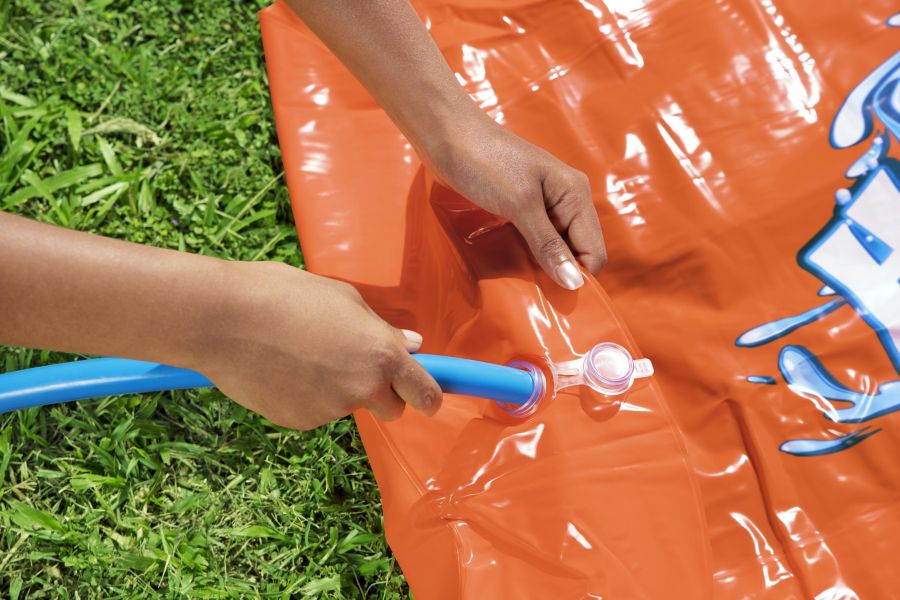 Pripojenie prostredníctvom adaptéra na záhradnú hadicu. Nafukovacia "SPLASH RAMP" - mäkká nafukovacia šmykľavka.
