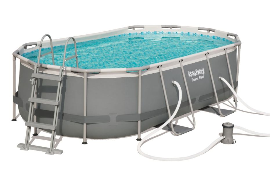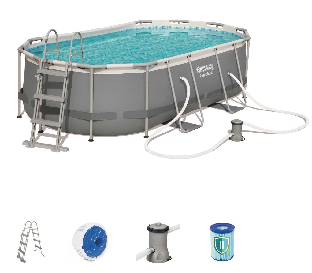 Oválny bazén Bestway Power Steel 4,27 x 2,5 x 1 m. Kompletná súprava bazénu s kartušovou filtráciou a schodíkmi.