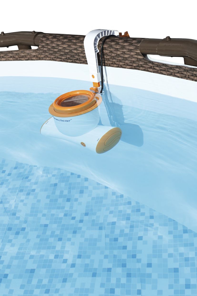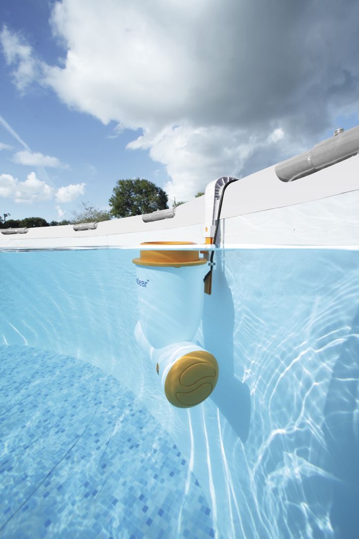 Filtračné čerpadlo SKIMATIC využíva napájanie 12 V prostredníctvom izolovaného transformátora, na inštaláciu filtrácie SKIMATIC nie je potrebná žiadna hadica ani adaptéry - stačí ju pripevniť na okraj bazéna.