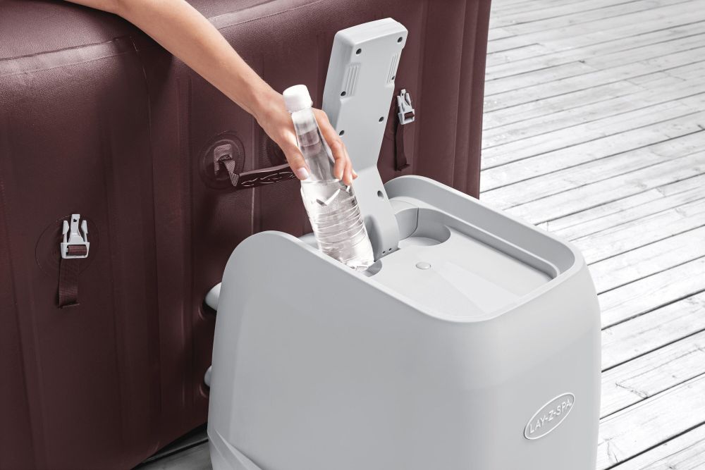 Hlavná riadiaca jednotka zabezpečuje všetky prevádzkové funkcie vírivky, a to výkonnú kartušovú filtráciu, prietokový digitálnyvzduchový kompresor na napúšťanie a následný prívod vzduchu a masážnych trysiek.