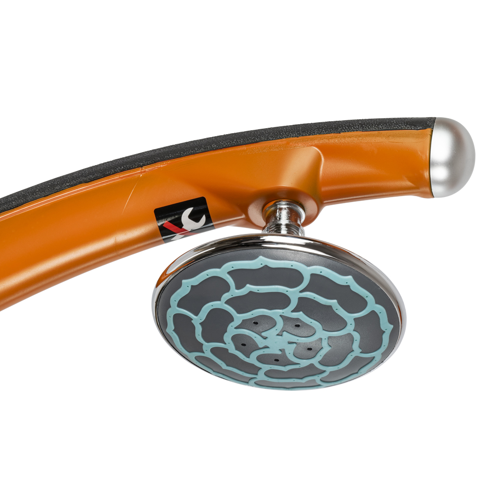 Solárna sprcha s plastovým telom a 30-litrovou nádržou na vodu, oranžovo-čiernej farby.