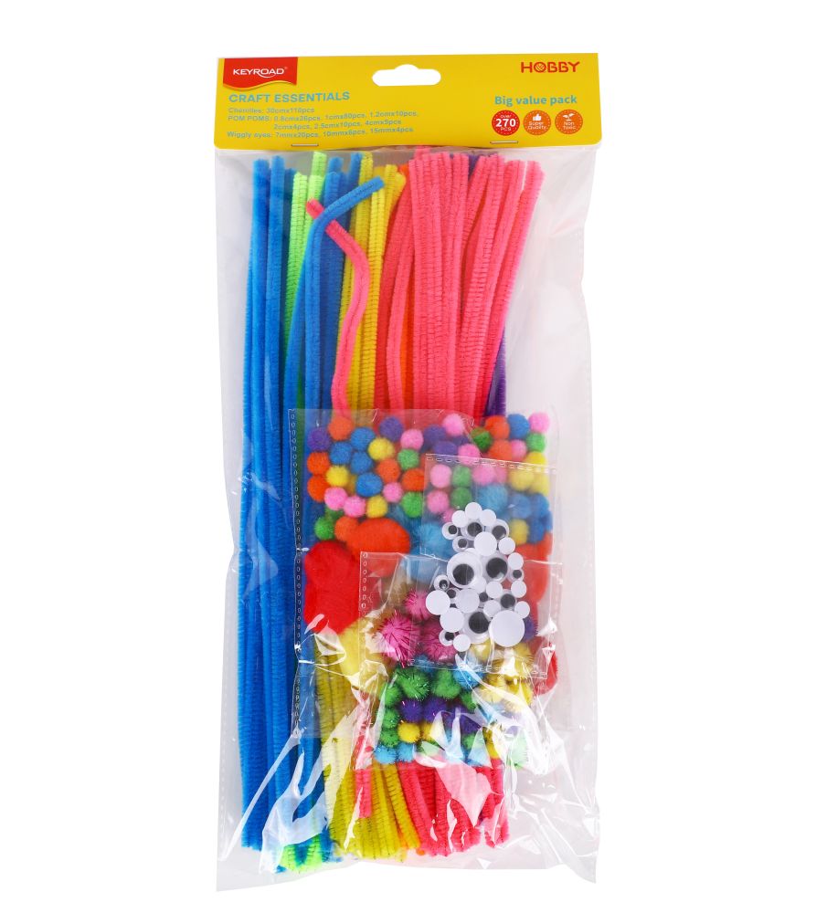 Táto bohatá tvorivá sada obsahuje viac ako 270 ks farebných bambuliek, chlpatých drôtikov a dekoračných očičiek. Všetky komponenty sú netoxické a vyrobené vo vysokej kvalite.