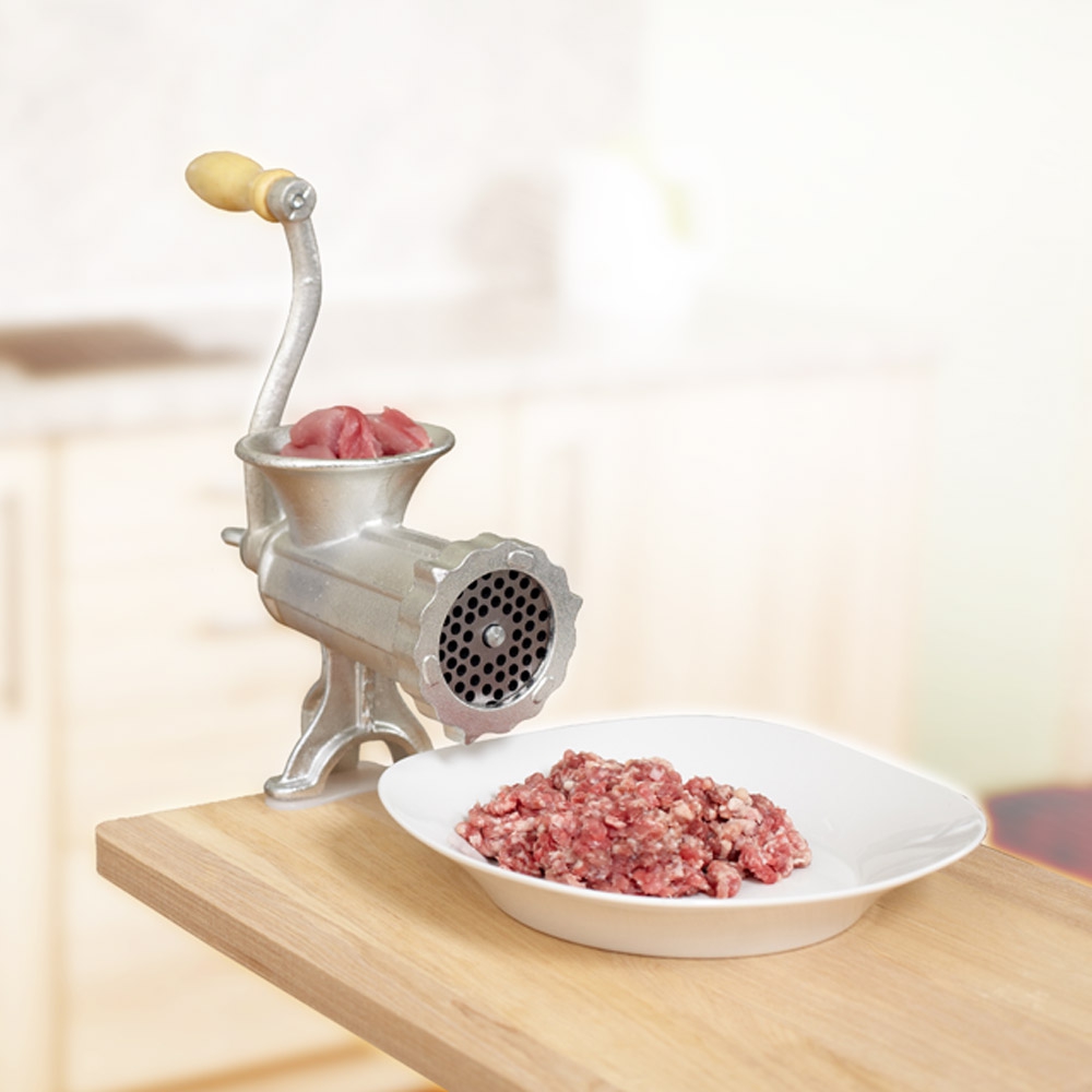 Mlynček na mäso s jednoduchou montážou a demontážou. Oba modely mlynčeka na mäso možno namontovať na stôl pomocou manipulačných skrutiek. Mlynček sa ovláda pomocou drevenej rukoväte.
