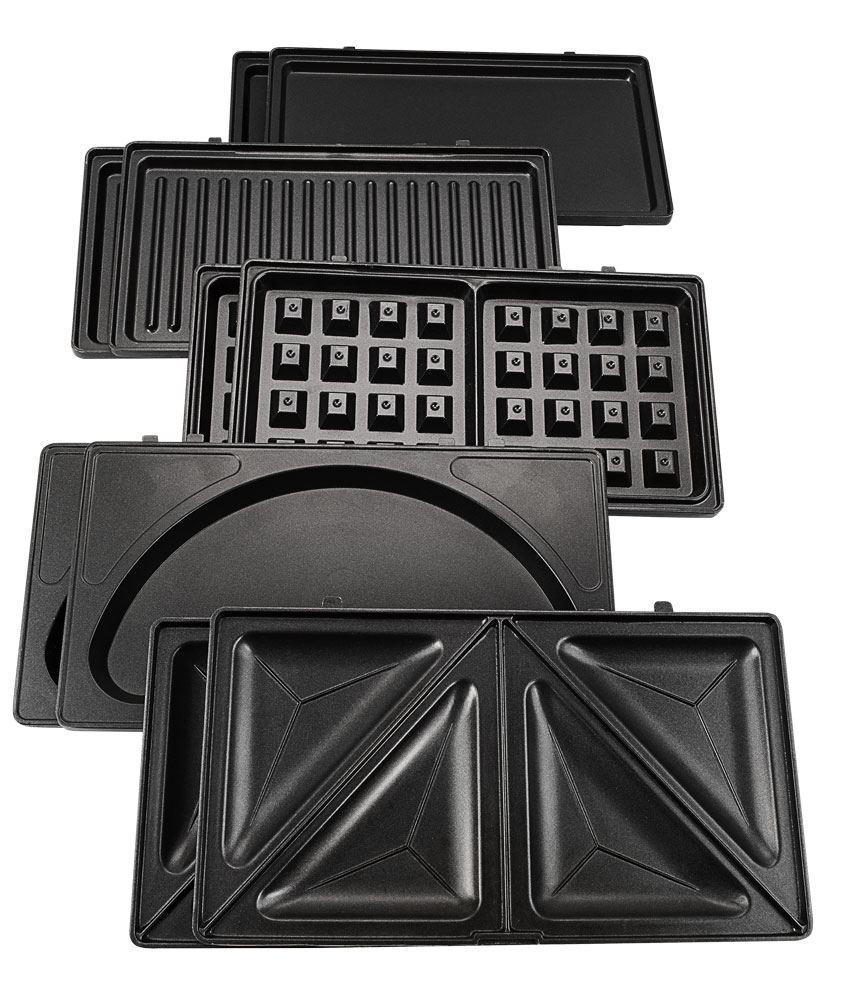 - 5 vyberateľných opekacích platní (omeleta, vafle, toast, plochý gril, drážkovaný gril)