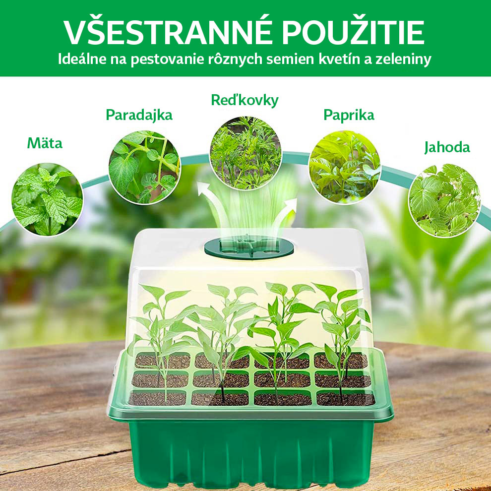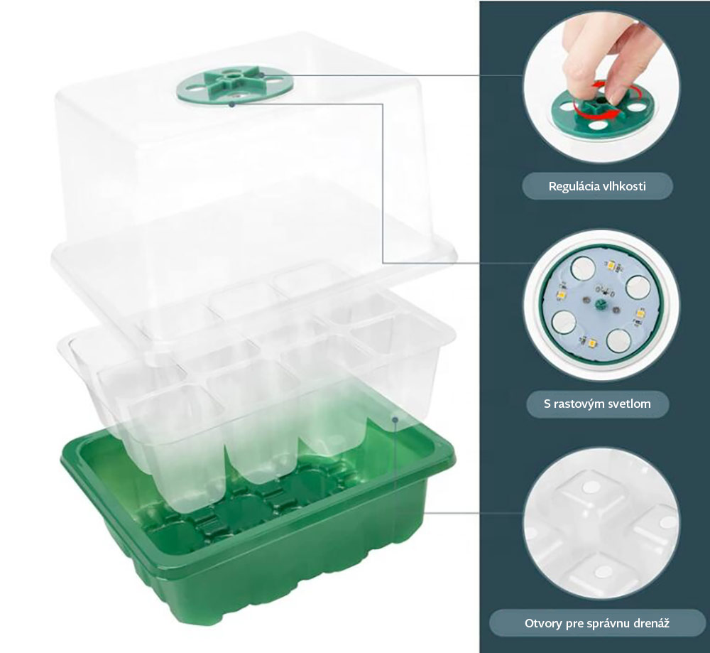 - regulácia vlhkosti a vetrania: priehľadný kryt má nastaviteľný otočný ventilačný otvor, ktorý vám umožní ľahko kontrolovať a udržiavať ideálnu úroveň vlhkosti vzduchu a teploty, čím vytvoríte dokonalú mikroklímu pre rýchle klíčenie semien