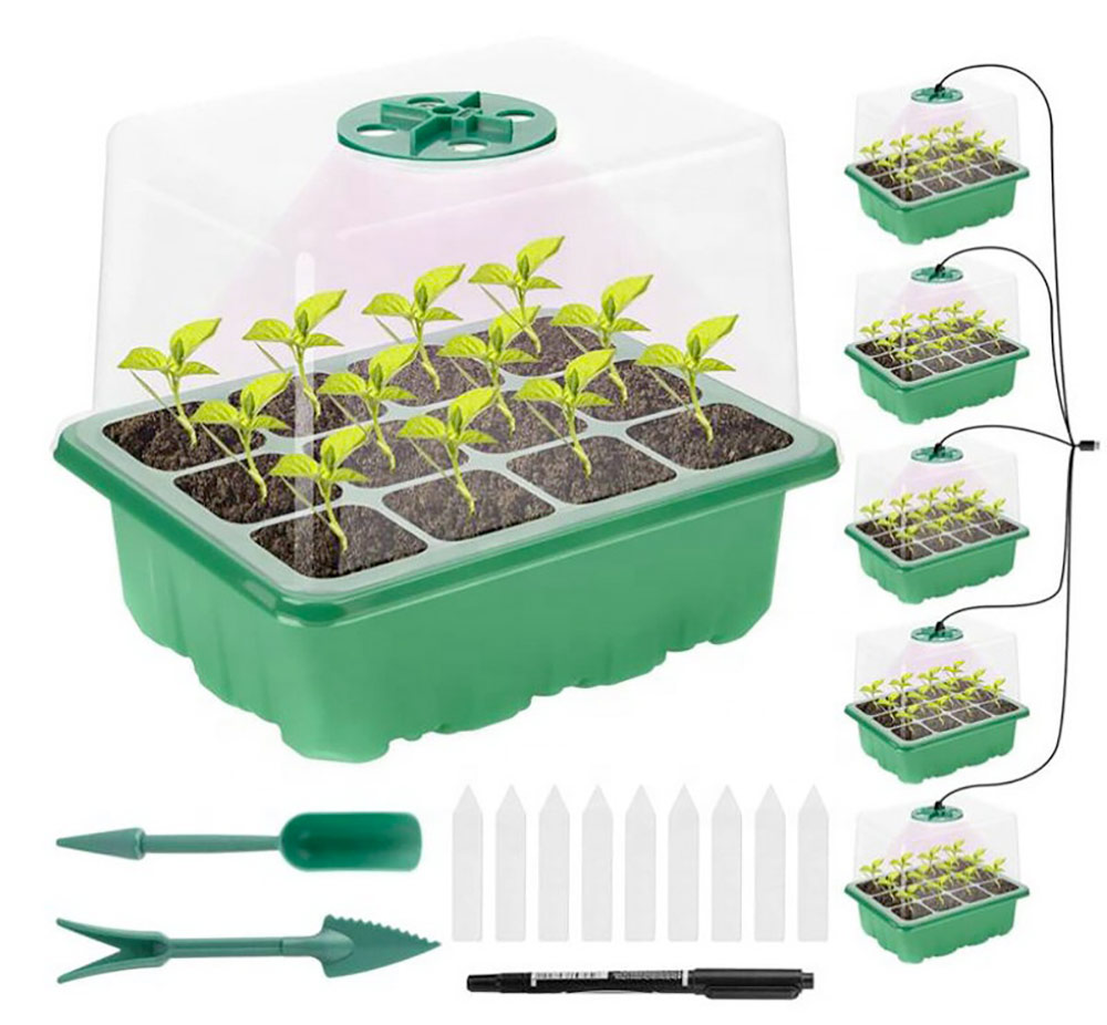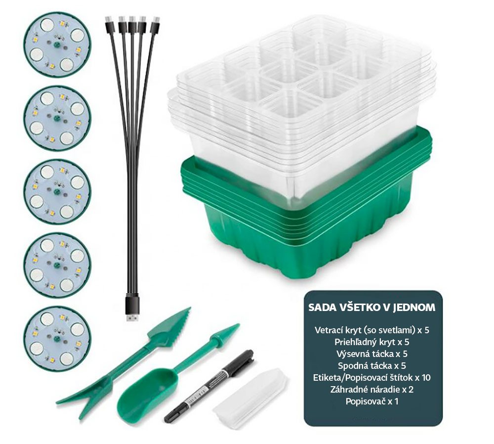 - kompletná sada obsahuje: 5x spodná tácka, 5x výsevná tácka s 12 bunkami, 5x priehľadný kryt s vetraním, 5x LED rastové svetlo s USB napájaním (sieťový adaptér 5V/2A nie je súčasťou dodávky), 2x záhradná popisovací štítok a 1x popisovač