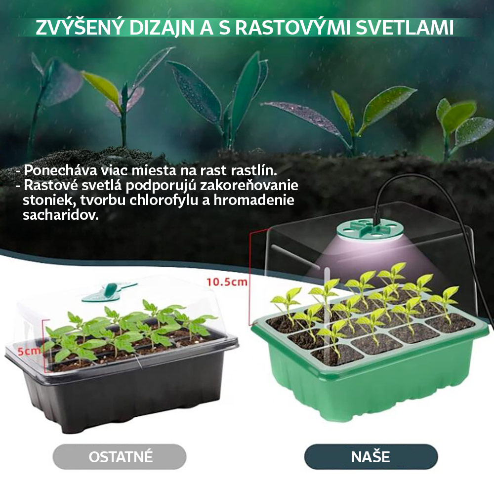 - integrované LED rastové svetlo: rastové svetlá dodávajú rastlinám potrebné spektrum pre ranú fázu života, podporujú zakoreňovanie, tvorbu chlorofylu a akumuláciu sacharidov, čo zaisťuje zdravšie a silnejšie sadenice, a to aj v období s nedostatkom slnečného svitu