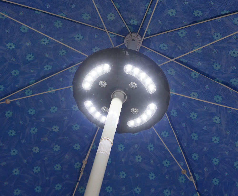 Osvetlenie pre dlhé letné večery na balkóne alebo terase, 24 LED diód dokonale osvetlí priestor pod slnečníkom. Osvetlenie LED sa ľahko inštaluje bez použitia náradia na tyč slnečníka jednoduchým zacvaknutím. Pomocou dvoch prepínačov na bočnej strane osvetlenia LED môžete vybrať jeden z režimov osvetlenia (aktivácia 4, 20 alebo všetkých 24 LED diód).