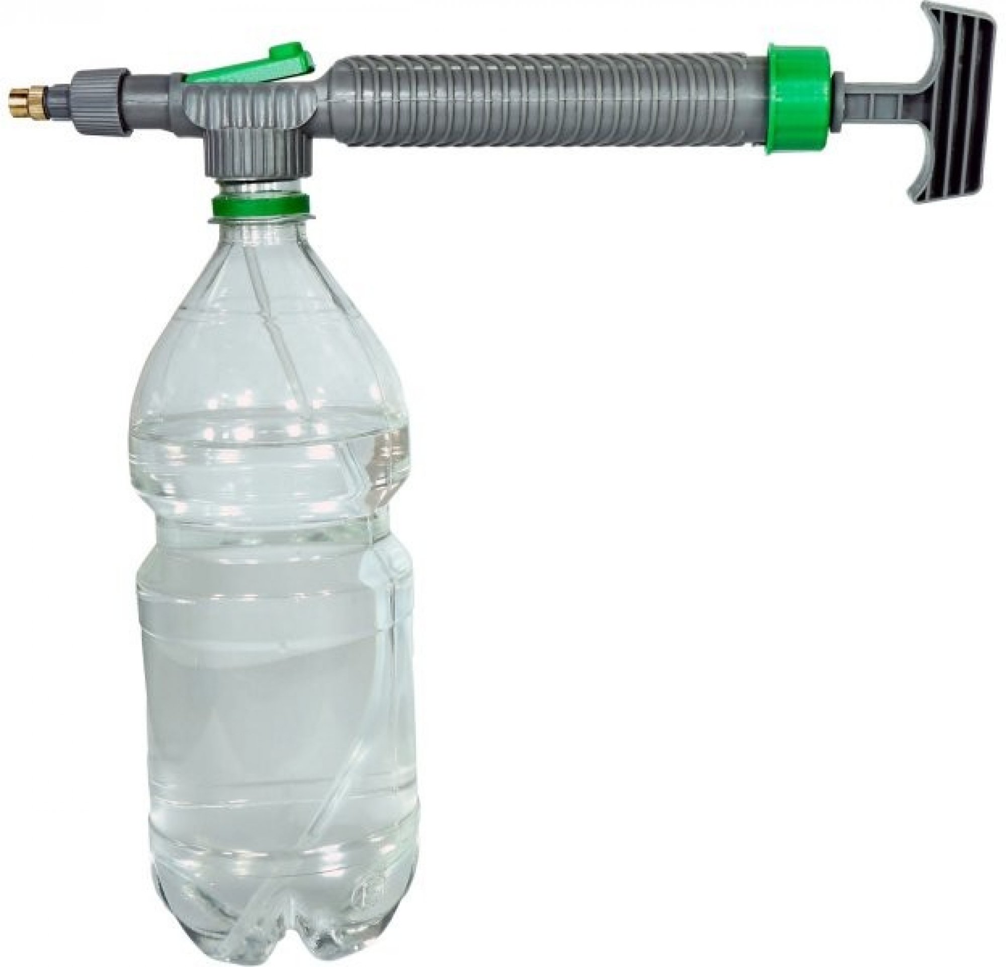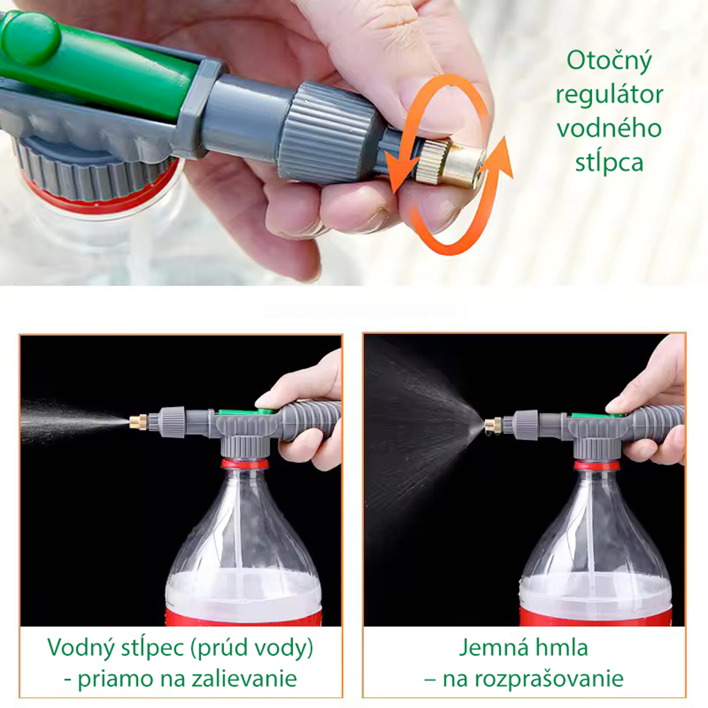 Na PET fľašu nasadíte uzáver, stlačíte čerpadlo a stlačením spúšte začnete striekať.