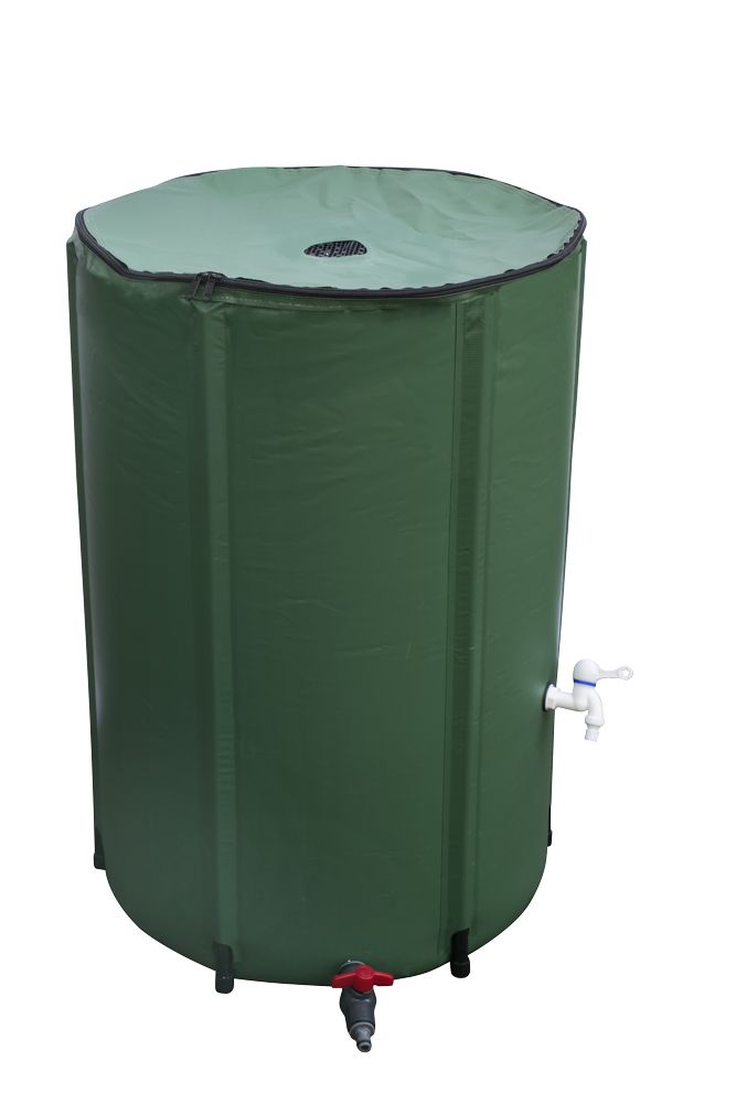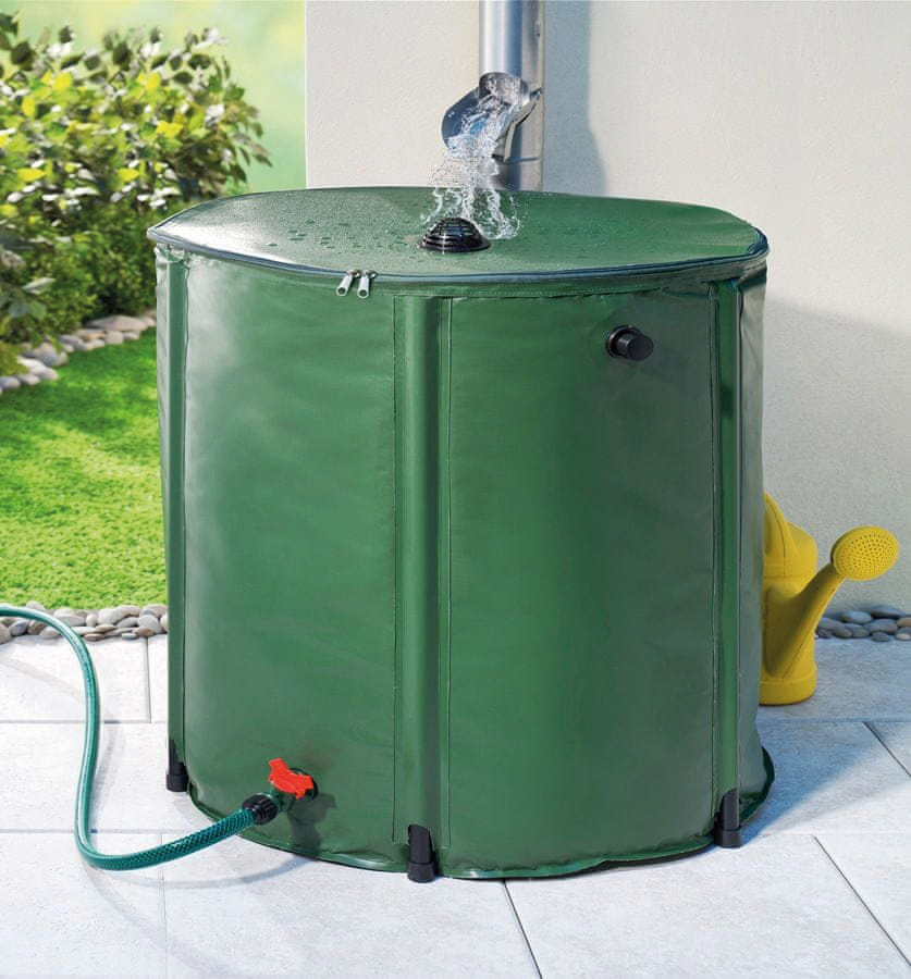 Skladacia nádrž vhodná na zhromažďovanie a skladovanie dažďovej vody a jej následné používanie na polievanie záhrady.