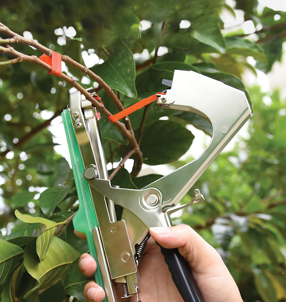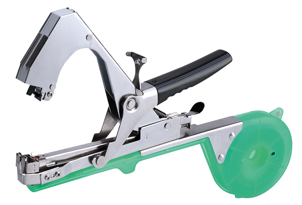 Automatické kliešte na viazanie rastlín na rýchle upevnenie rastlín pomocou PVC pásky a svoriek.