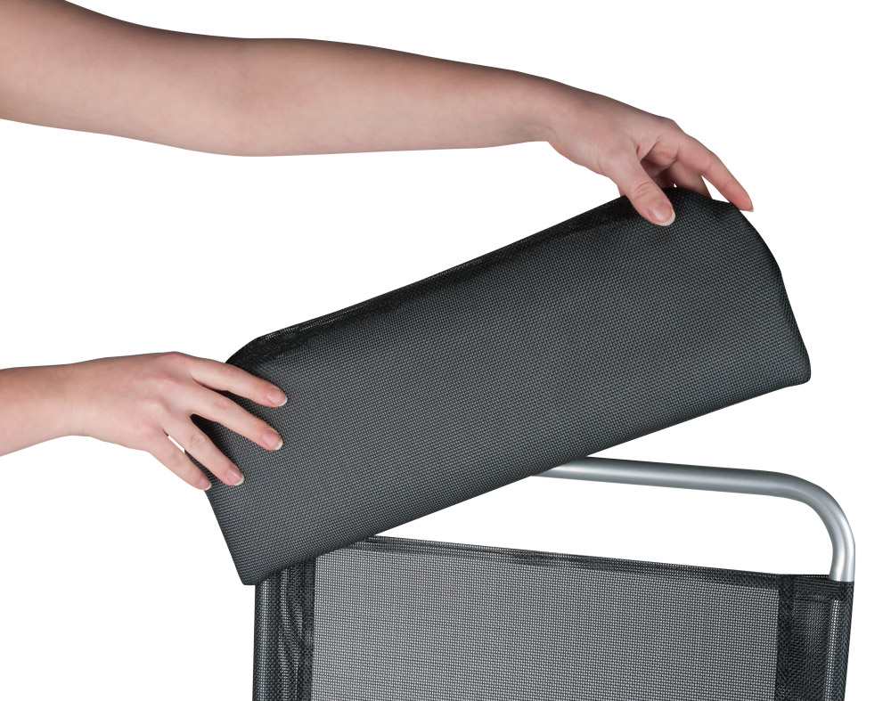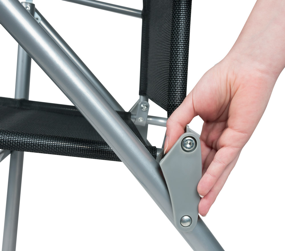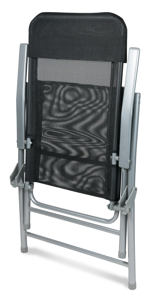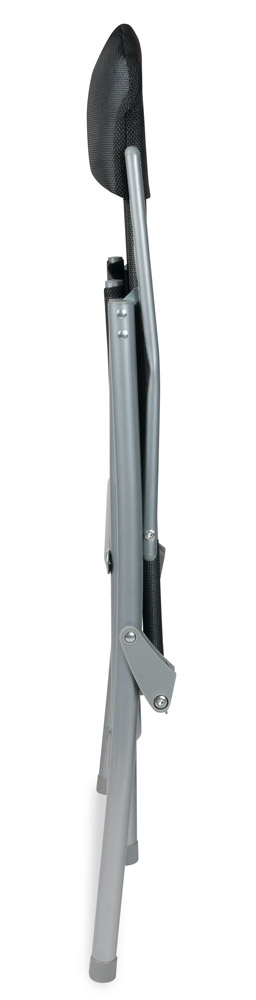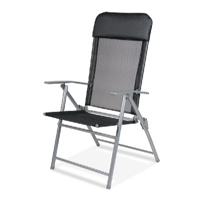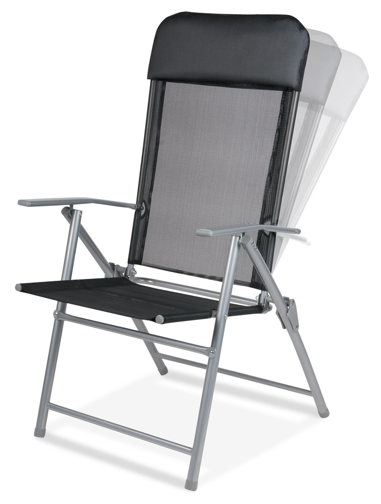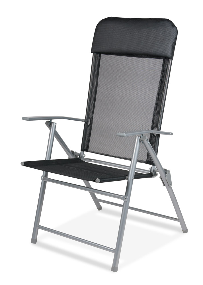 Skladacie záhradné kreslo s podrúčkami, materiál kov (prášková farba - komaxit strieborný) a plastová tkanina (polyester), odpudzujúca vodu. Záhradné kreslo je skladacie a tiež polohovateľné (3 polohy).