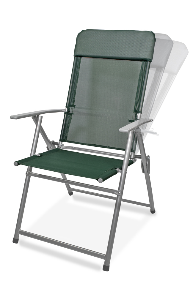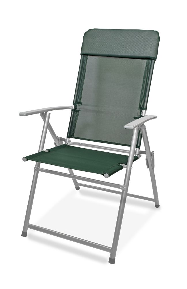 Skladacie záhradné kreslo s podrúčkami, materiál kov (prášková farba - komaxit strieborný) a plastová tkanina (polyester), odpudzujúca vodu. Záhradné kreslo je skladacie a tiež polohovateľné (3 polohy).