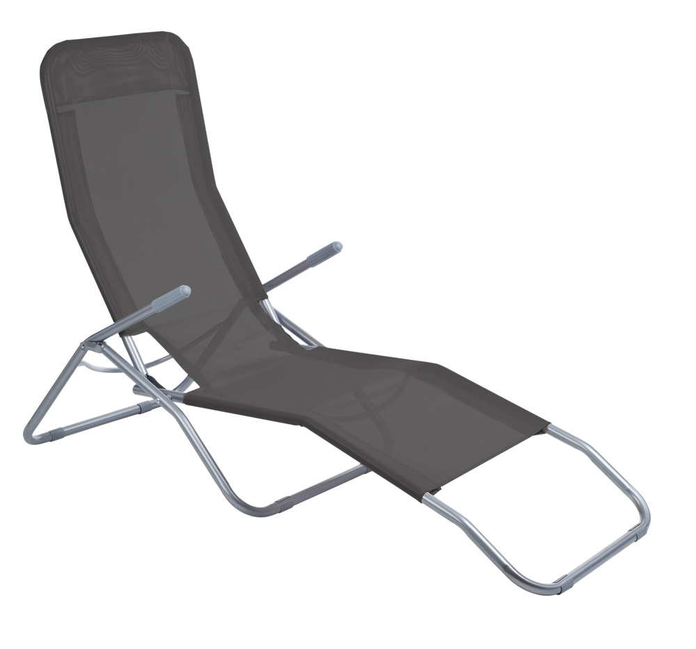 Skládací zahradní lehátko s područkami, materiál ocel (povrchová úprava prášková barva stříbrná) a umělá tkanina (polyester), nenasakující vodu. Zahradní lehátko lehátko je velmi pohodlné, nenáročné na skladování, vhodné na terasy, zahradu nebo kempování.