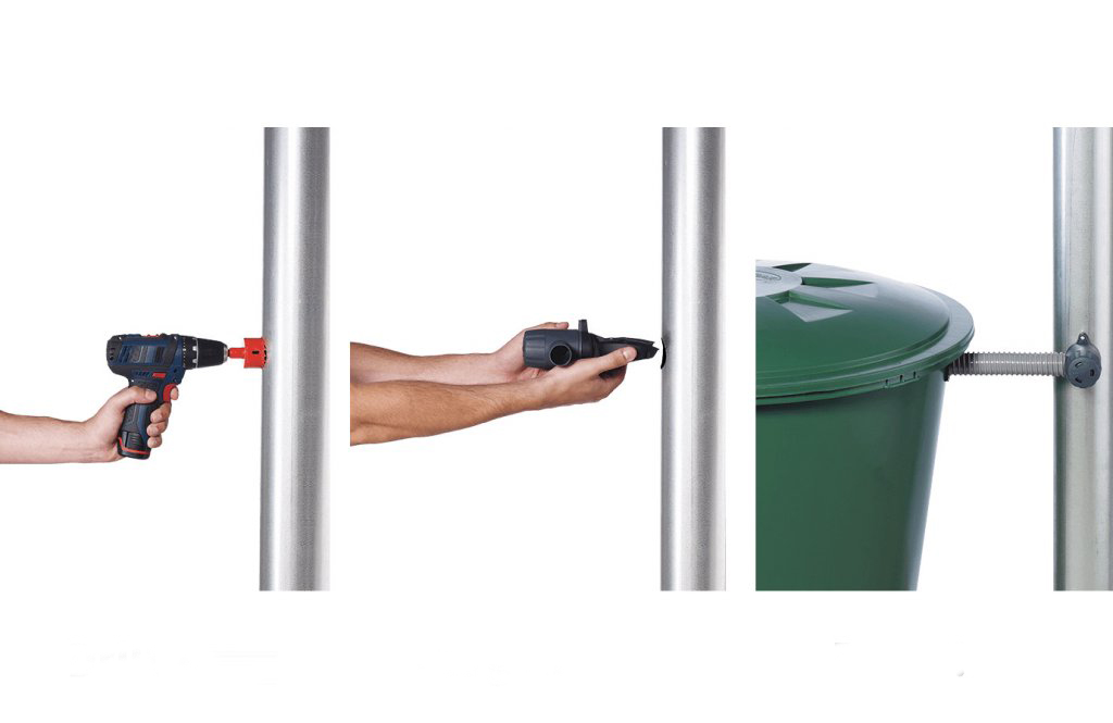 - Kompletná inštalačná sada: V balení nájdete všetko potrebné na inštaláciu na odkvap aj na pripojenie k nádrži: korunový vrták na vytvorenie otvoru v odkvape aj v nádrži, tesnenie a 50 cm flexibilnú hadicu s 32 mm (1 1/4) pripojením k sudu. Sud nie je súčasťou balenia.
