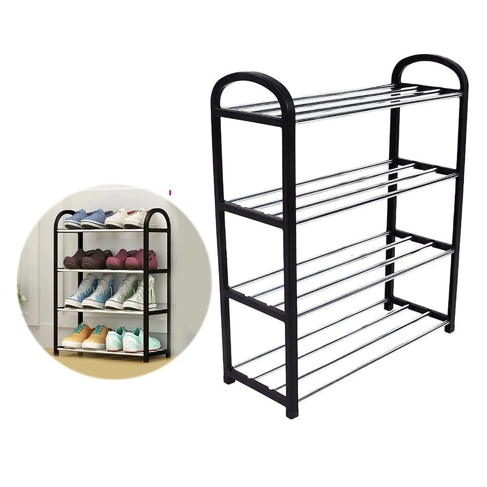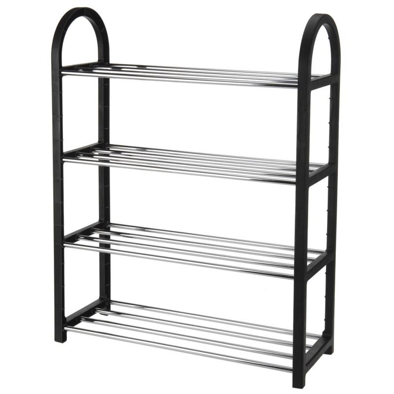 Malý elegantný a praktický stojan na topánky, pochrómované rúrky, plastové boky v čiernej farbe.