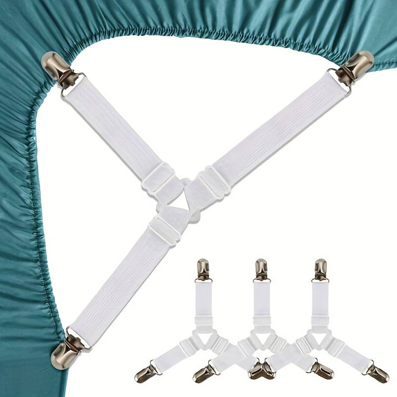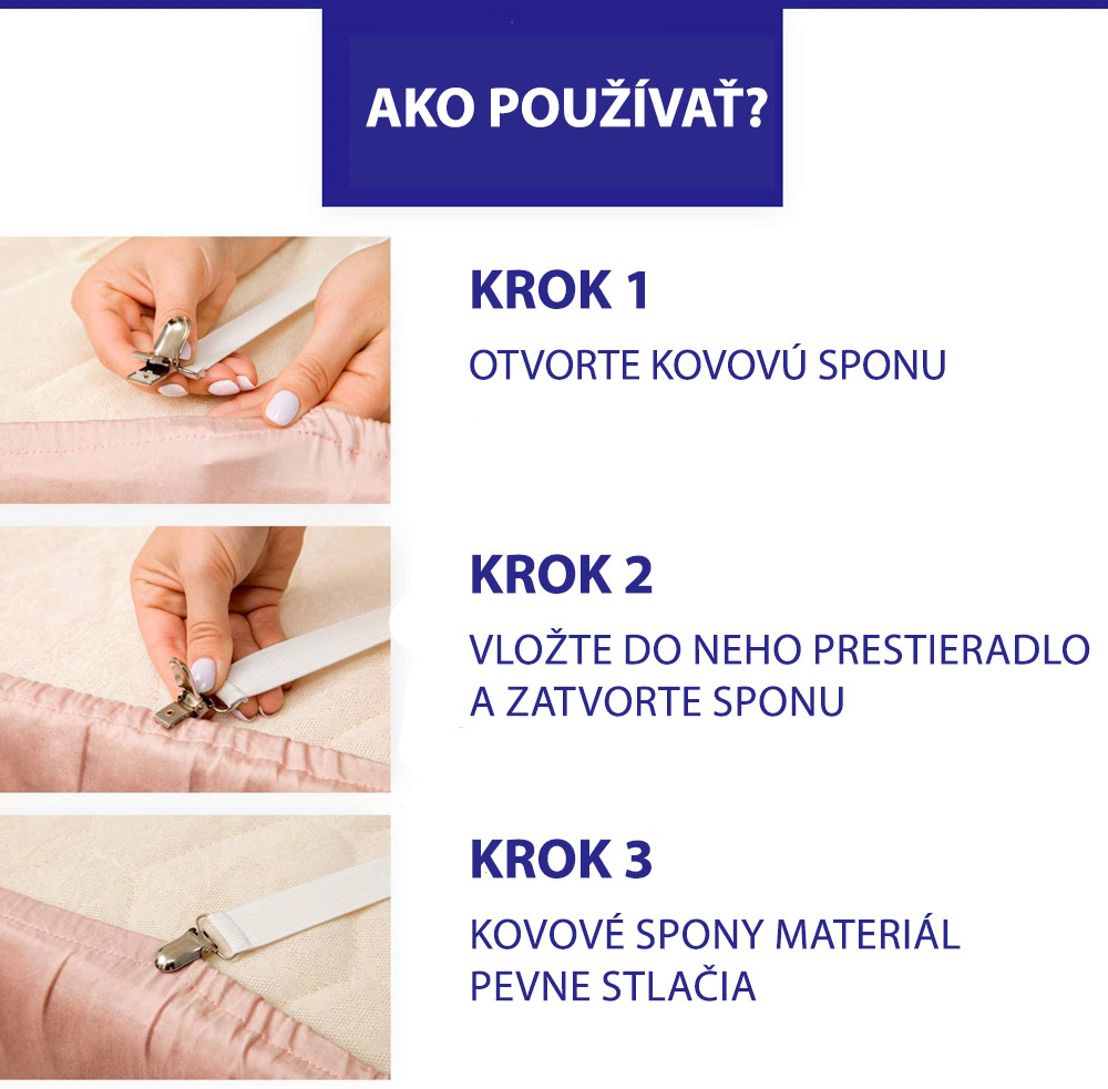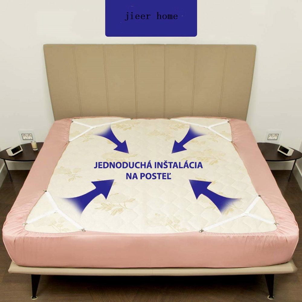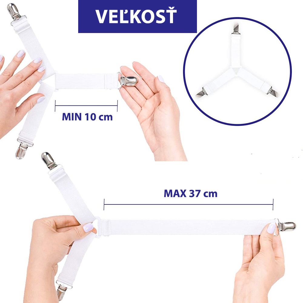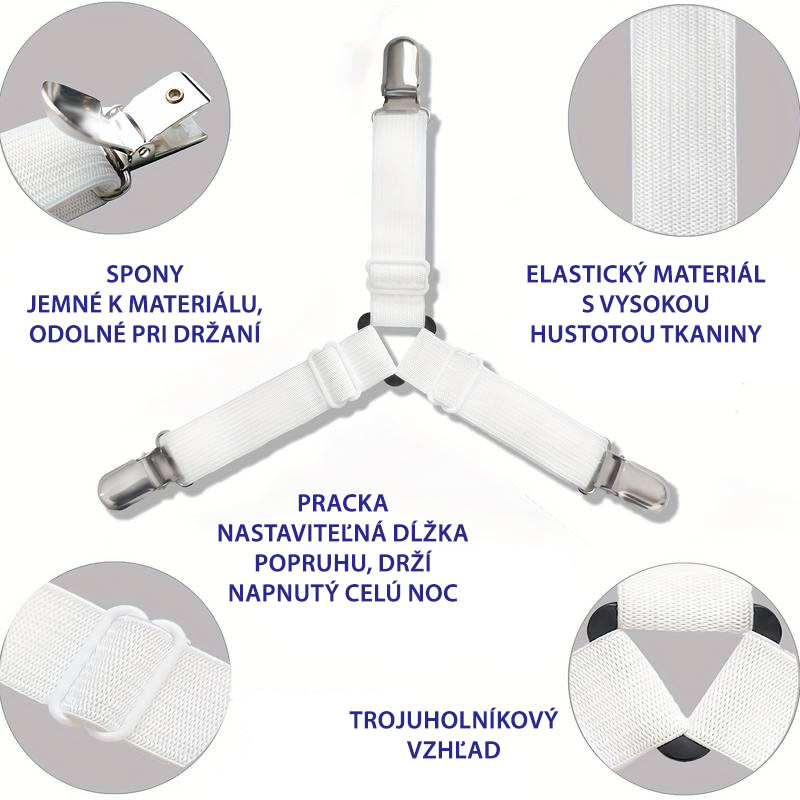 Perfektné priliehavé prestieradlo! 4 elastické popruhy na prestieradlo s klipmi v rohu prestieradla, vďaka ktorým bude prestieradlo spoľahlivo držať na mieste a bude krásne napnuté.