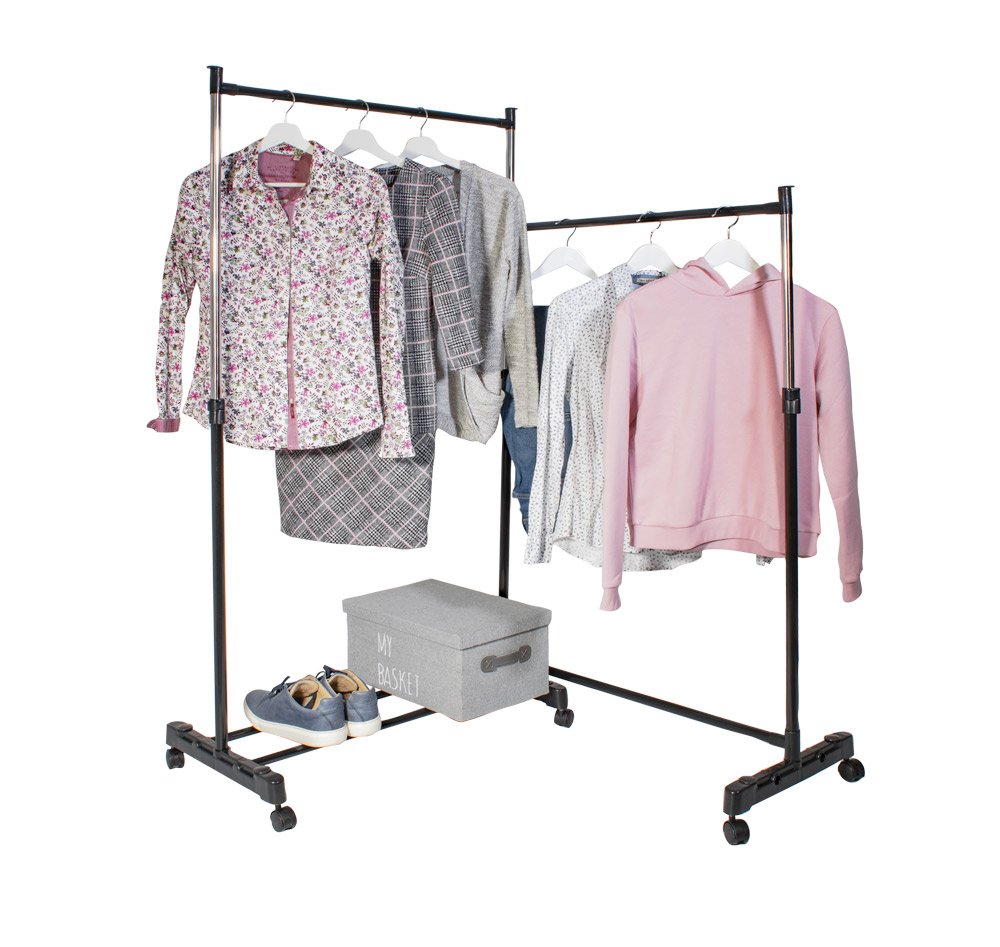 Praktický stojan na šaty slouží jako držák ramínek na šaty, kabáty, kabelky,.... Díky kolečkům je stojan na šaty mobilní, lze s ním tedy bez problémů manipulovat. Možnost umístění do rohu místnosti.