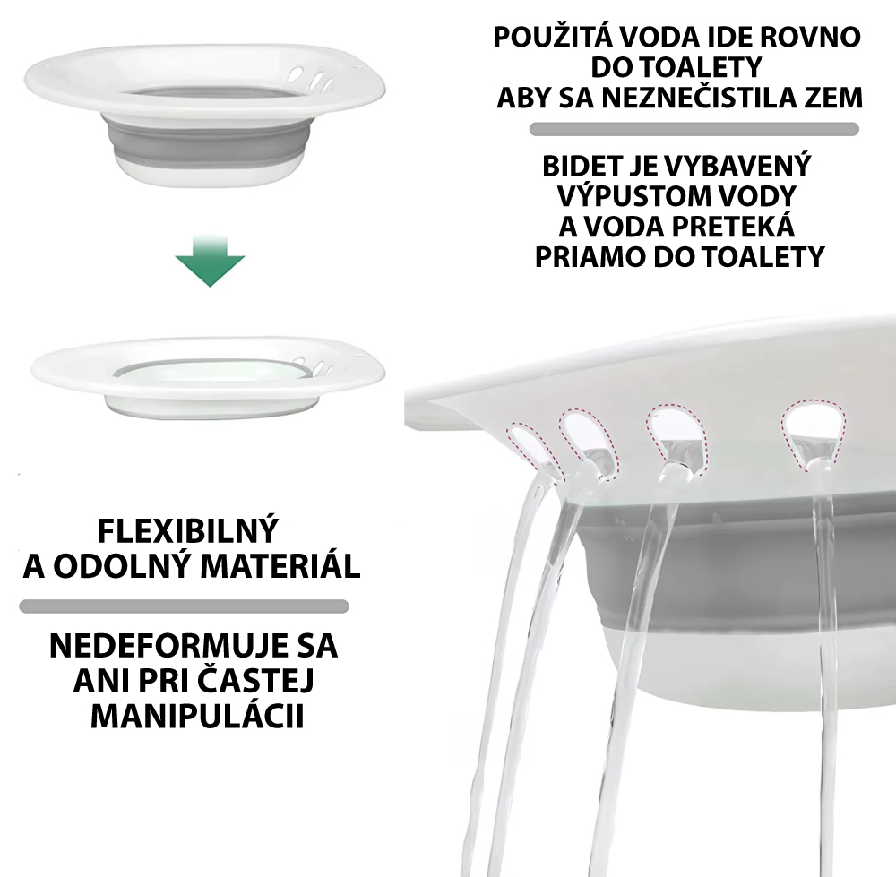 Prenosný bidet s pumpičkou je vhodný pri liečbe sedavých partií, hemoroidov, pri ochorení močového mechúra, obličkové alebo črevné kolice, pri infekčných ochoreniach alebo menštruácii. Prenosný bidet je ideálny na prevenciu rôznych ochorení. Jednoduchá a jednoduchá inštalácia - nasadíte na okraj záchodovej misy. Po použití bidetu, vodu jednoducho vylejete do toalety. Prenosný bidet uľahčí intímnu hygienu a je vhodný aj na terapeutické sedacie kúpele.