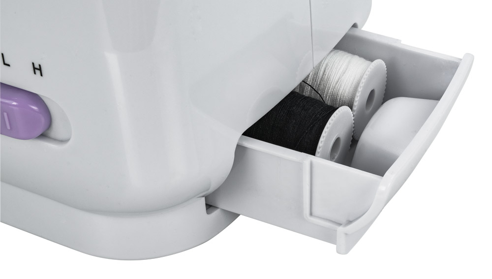 6 cievok, pätka na gombíkovú dierku, 2x náhradná ihla, navliekač nite, meter, adaptér, nožný pedál