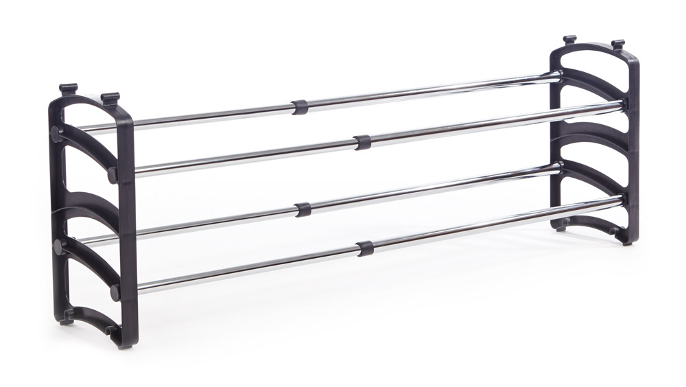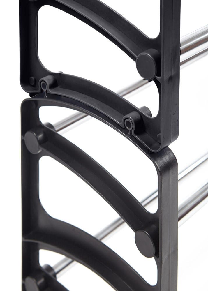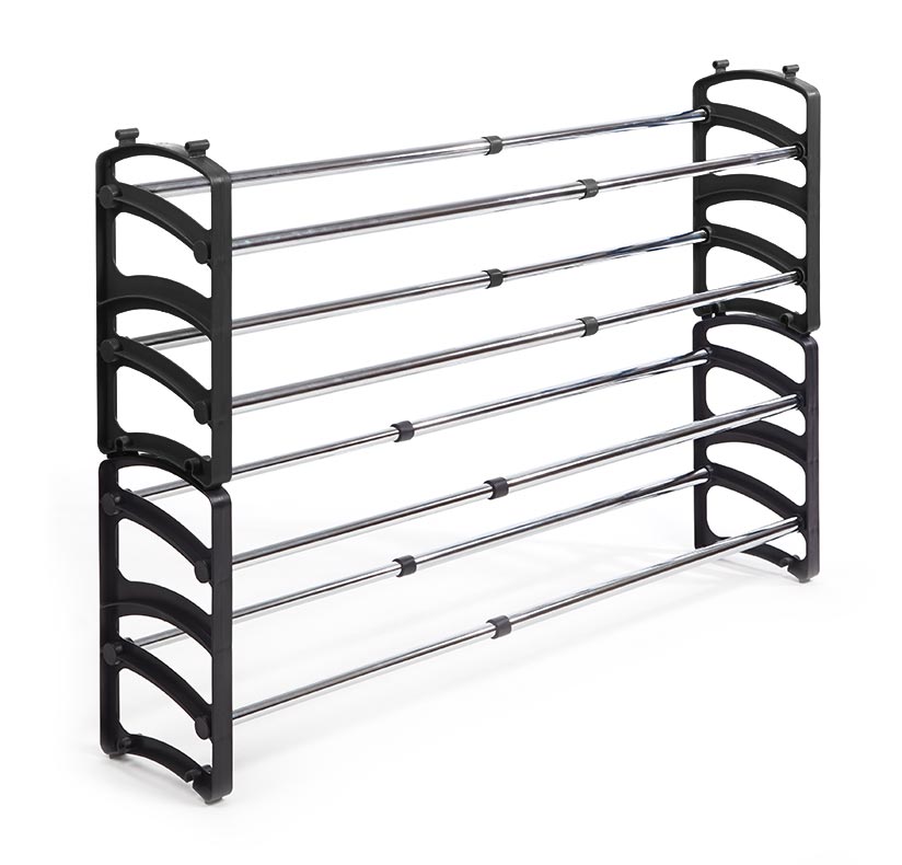 Dvojposchodový stohovateľný regál na topánky je ideálny nielen na ukladanie topánok. Regály na topánky možno stohovať a vytvoriť tak viac úložného priestoru. Regál na topánky je vhodný do predsiene alebo chodby, ale dá sa použiť aj ako regál do šatníkových skríň, vstavaných skríň alebo na vytvorenie samostatne stojaceho regálu. Regál na topánky má police vyrobené z kovu, bočné strany sú plastové so zámkami. Do teleskopického regálu na topánky môžete naskladať až 10 párov topánok v závislosti od dĺžky nadstavca.