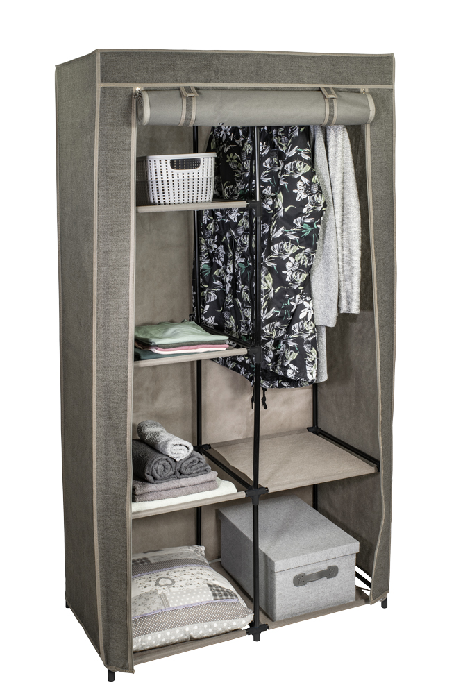 Skladacia textilná skriňa na prehľadné uloženie vecí (oblečenie, hračky,...). Textilnú šatníkovú skriňu s policami možno zostaviť za okamih, je vyrobená zo vzdušného materiálu, konštrukciu tvorí stabilná oceľová konštrukcia.