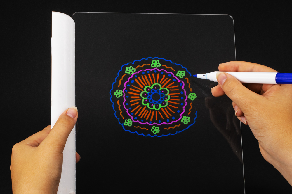 Balenie obsahuje: priehľadná doska na maľovanie, podstavec s LED svetlom, 3D okuliare, handrička na utretie dosky, 9x obojstranné predlohy, 4 fluorescenčné fixky.
