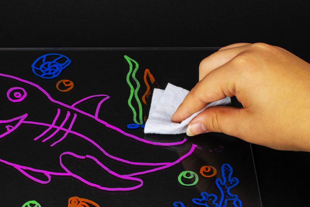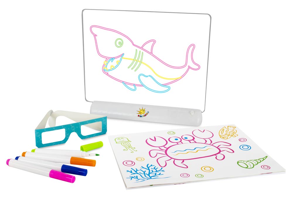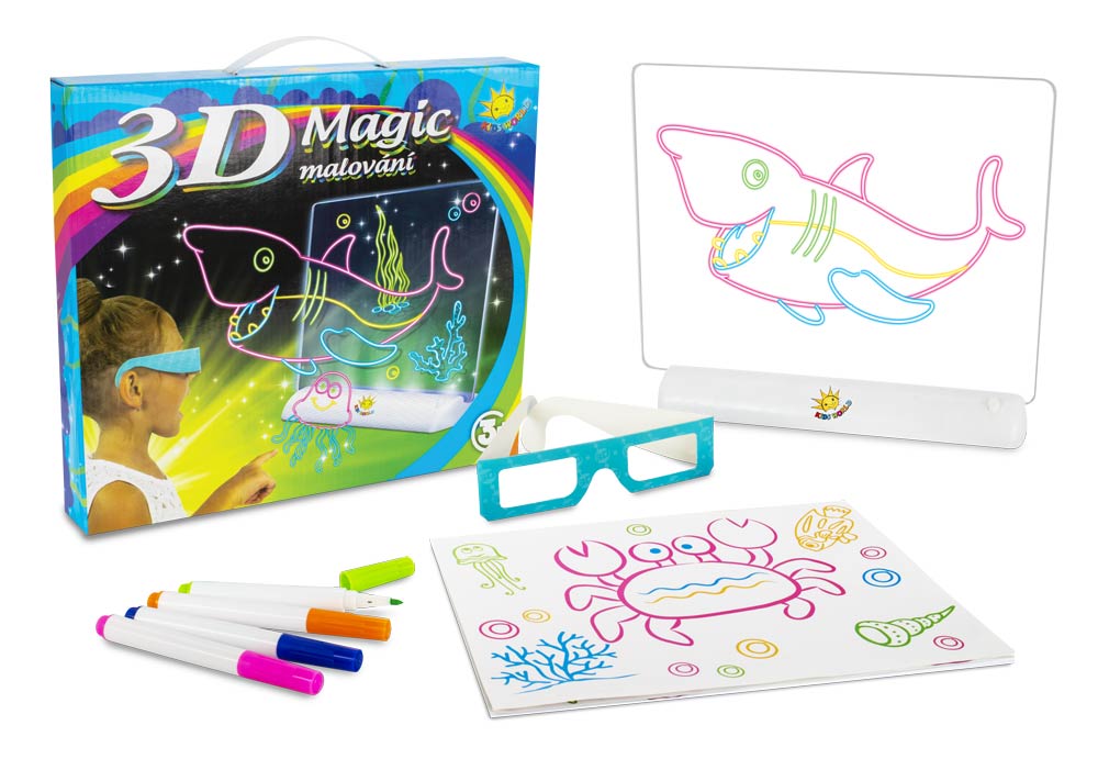 S magickú tabuľkou s podsvietením a 3D okuliarmi sa stane aj obyčajné maľovanie naozajstným zážitkom. Pomocou pripravených predlôh s úžasnými motívmi namaľujte farebnými fixkami na tabuľku obrázok a potom už len stačí rozsvietiť svetlo, nasadiť priložené okuliare a ponoriť sa do hlbín oceánu, vesmíru alebo iného čarovného sveta s 3D efektom.
