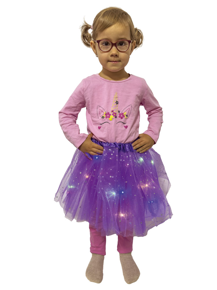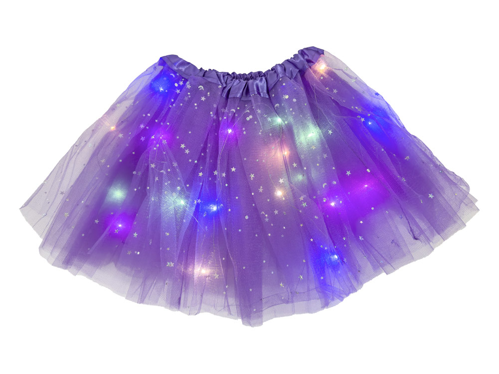 Vrstvená baletná tutu sukňa LED so svetlami vytvára pri pohybe čarovné svetelné efekty ako v rozprávke! Svetelná sukňa LED je vyrobená z kvalitného polyesterového materiálu a je mäkká a pohodlná. Žiarivé farby v kombinácii so svetelnými šnúrkami LED vytvárajú pri pohybe dieťaťa priam magický efekt. V páse sa nachádza malá plastová krabička s vypínačom a miestom na vloženie batérií. Svietiaca sukňa s LED diódami má elastický pás, a preto rastie spolu s dieťaťom, môže sa používať dlhý čas.