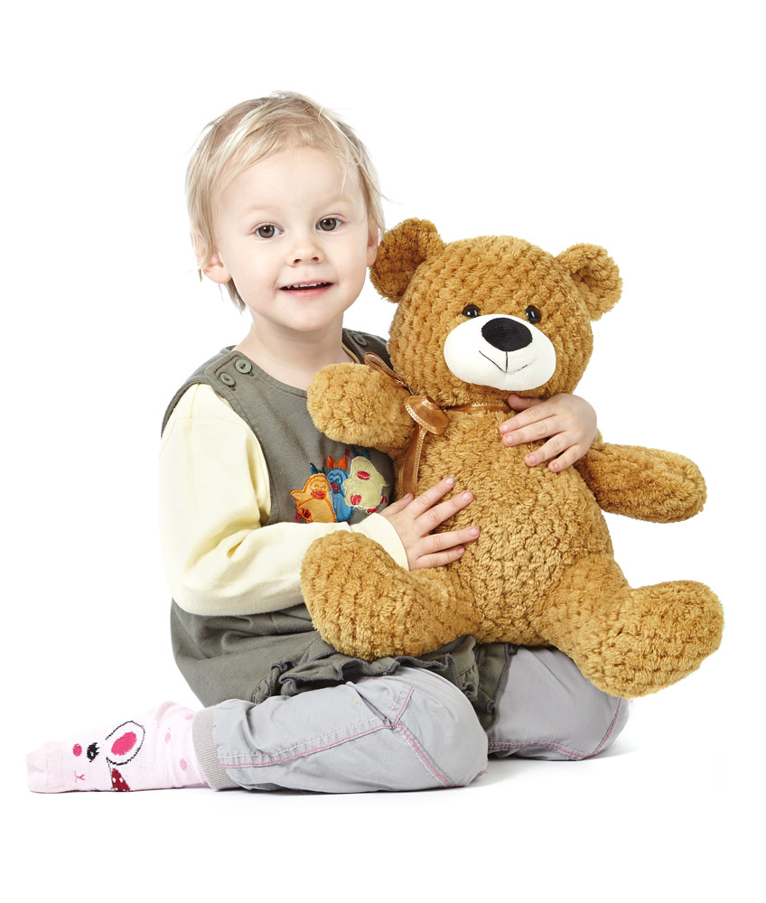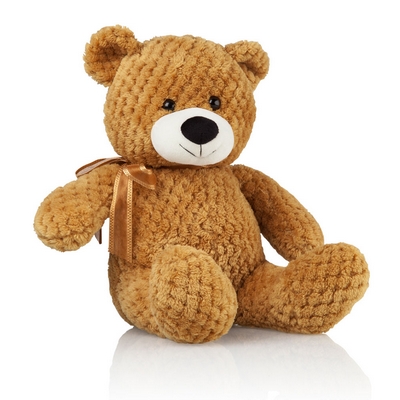 Medvedík je vhodným domácim miláčikom nielen do postieľky. Plyšový medveď vždy poteší deti všetkých vekových kategórií. Medvedík má okolo krku uviazanú mašľu.