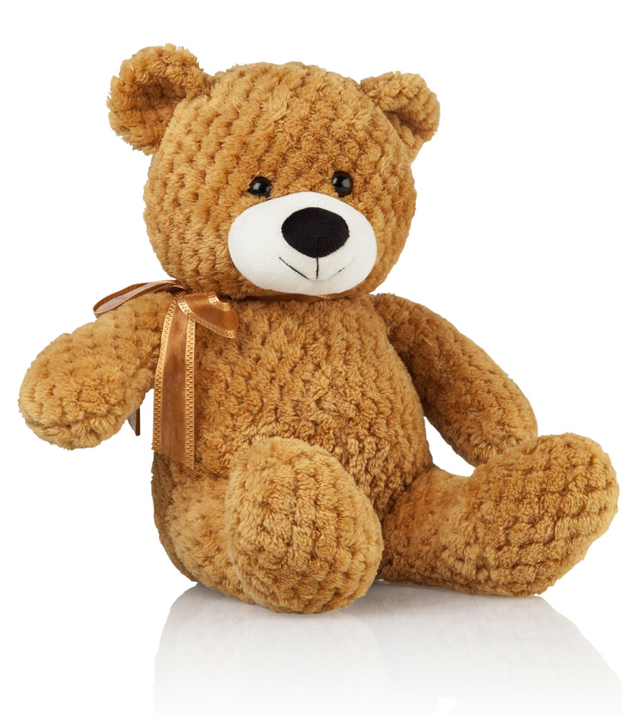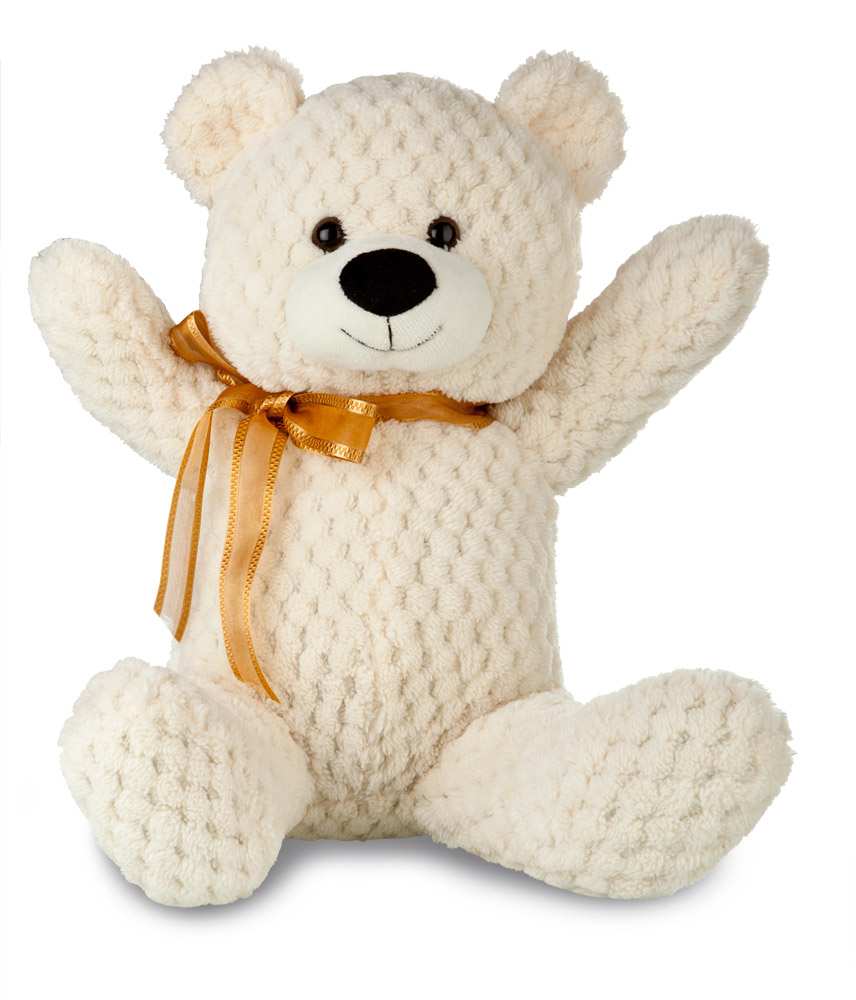Medvedík je vhodným domácim miláčikom nielen do postieľky. Plyšový medveď vždy poteší deti všetkých vekových kategórií. Medvedík má okolo krku uviazanú mašľu.
