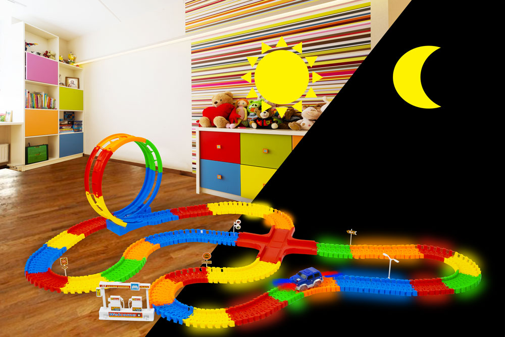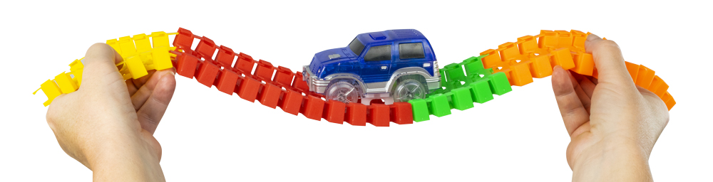 Neónová pretekárska dráha svietiaca v tme. Flexibilné diely sa ľahko spájajú do rôznych farebných kombinácií a umožňujú meniť tvar a dizajn dráhy. Svietiaca autodráha MAXI RACE rozvíja detskú tvorivosť a predstavivosť, autíčko s LED svetlami vytvára pri jazde svetelné efekty.