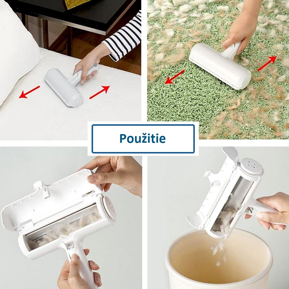 Odstraňovač chlpov domácich zvierat na účinné odstraňovanie chlpov, vlasov a drobných nečistôt z oblečenia alebo čalúneného nábytku. Odstraňovač/valček má vnútornú nádobu, v ktorej sú zachytené chlpy uložené a ktorú možno ľahko otvoriť a vyprázdniť.