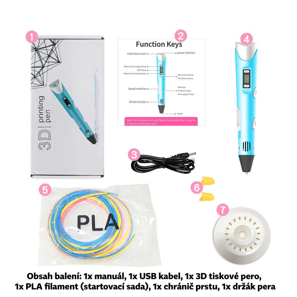 - Bezpečnosť predovšetkým: Naše 3D pero je vybavené ochranou proti prehriatiu a automatickým vypnutím po 5 minútach nečinnosti. Kovová tryska sa síce zahrieva, preto sa jej nedotýkajte a po použití pero nechajte vychladnúť v držiaku.