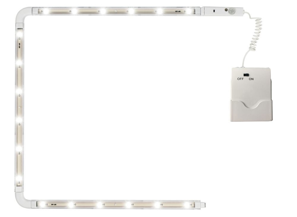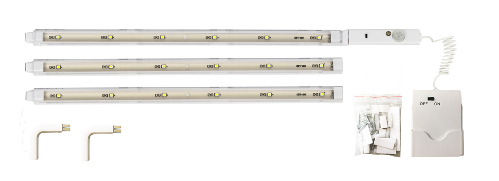 3 LED pásy, 2x rohový konektor, detektor pohybu s časovačom (doba svietenia 1 min alebo 30 s), batériový box, inštalačný materiál