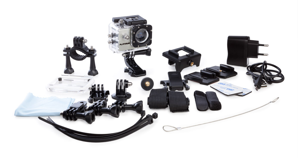Držiak kamery 3 ks, základňa s fix. páskou 2 ks, držiak základne s fix. páskou, držiak puzdra, základňa, puzdro, svorka puzdra, upínacia páska, fix. 3 m pásky 2 ks, kábel s očkami, uťahovacie pásky 4 ks, držiak na bicykel, zadný kryt kamery, adaptér, kábel USB, čistiaca handrička