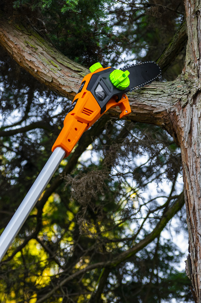 Akumulátorová teleskopická prerezávacia píla vám umožní ľahko a rýchlo rezať konáre vysoko nad zemou bez námahy a bez potreby rebríka.