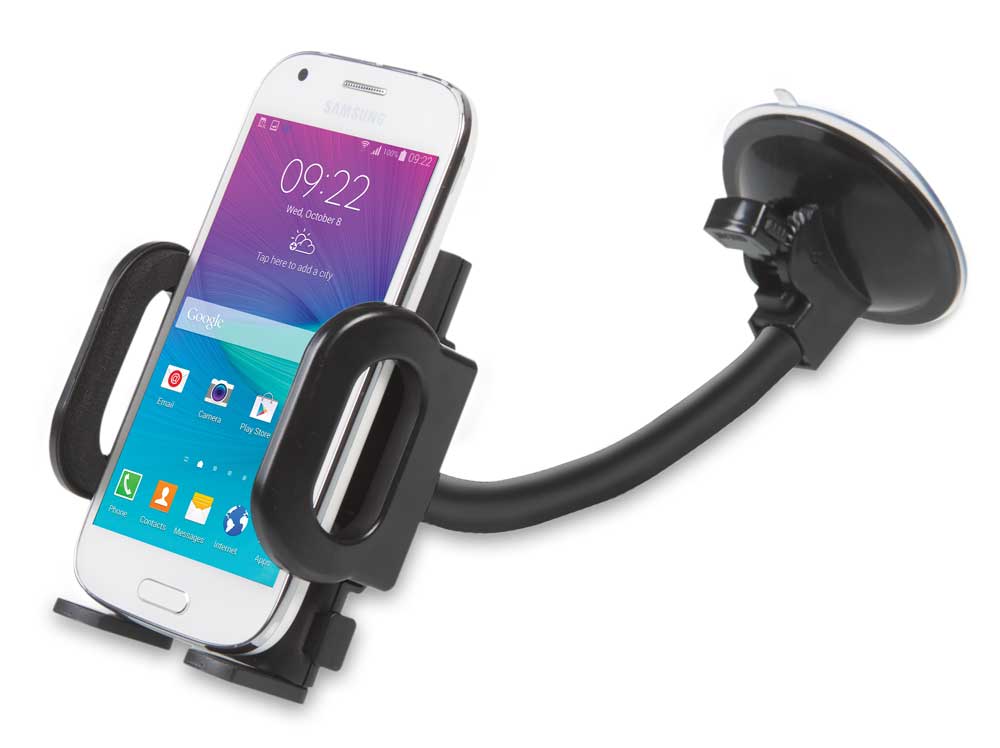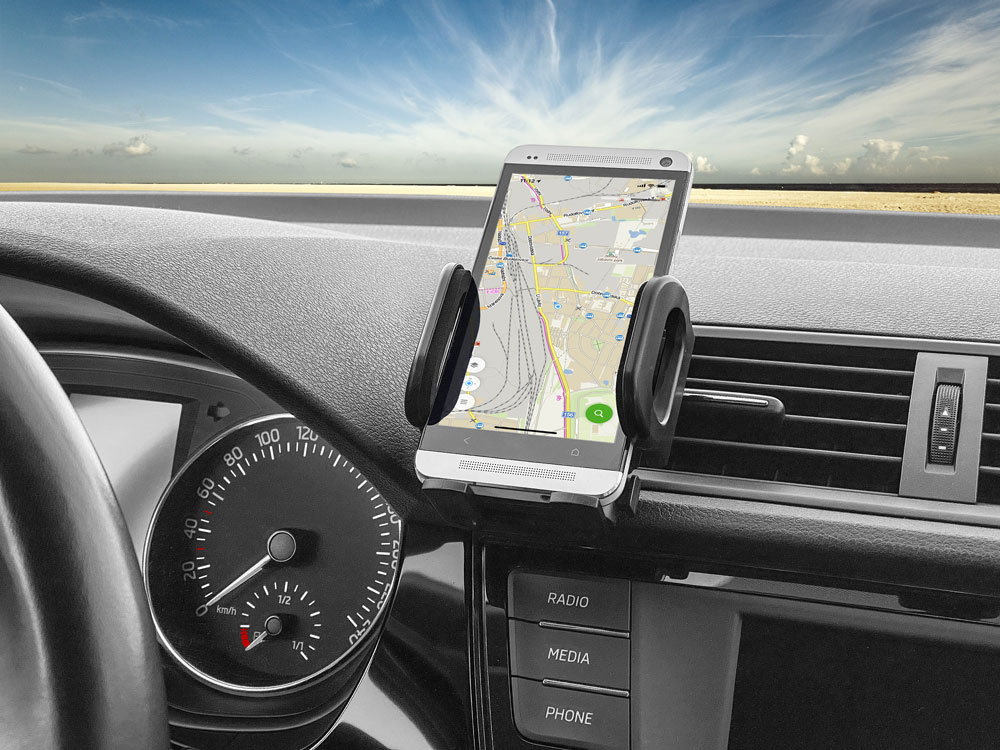 Univerzálny držiak je určený pre mobilné telefóny, smartfóny, navigačné systémy atď. s montážou na čelné sklo vozidla. Ľahko nastavíte požadovaný uhol na optimálne sledovanie.