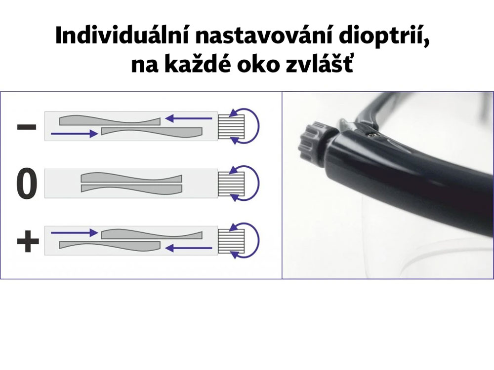 - Individuálne nastavenie dioptrií: jednoduchým otočením kolieska si nastavíte presnú silu šošoviek, ktorú potrebujete, a to vždy pre jedno oko