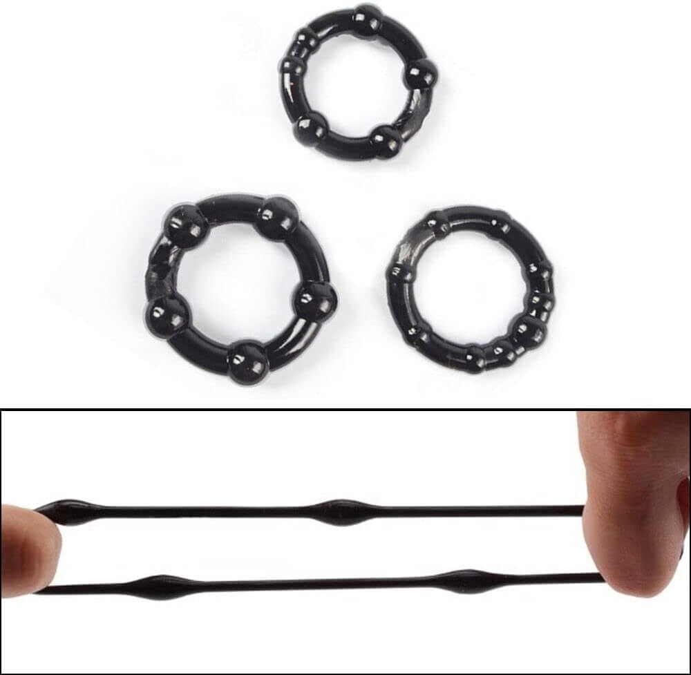 Tri čierne erekčné krúžky s rôznymi vnútornými priemermi zabezpečujú pevnejšiu a dlhšiu erekciu. Erekčné krúžky sú flexibilné a dajú sa veľmi široko roztiahnuť.