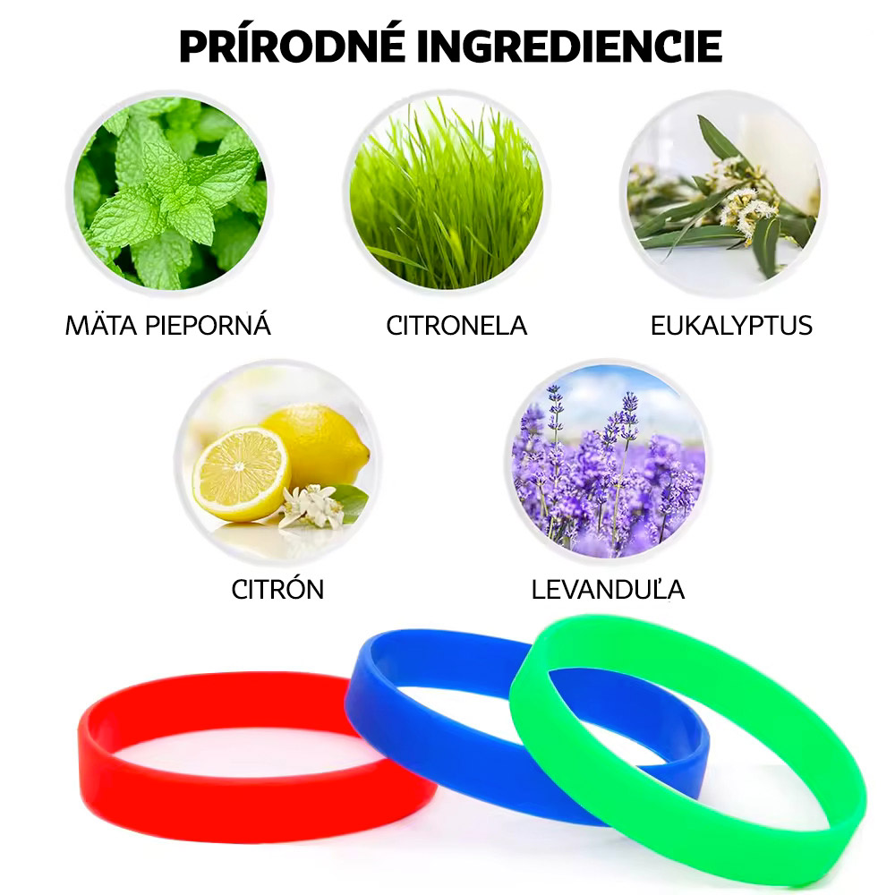 Náramok je napustený 100 % prírodnými esenciálnymi olejmi(levanduľa, mäta pieporná, citronela, citrón, eukalyptus), ktoré odpudzujú komáre a kliešte až 350 hodín. Vôňa je pre človeka príjemná a nezaťažuje organizmus.